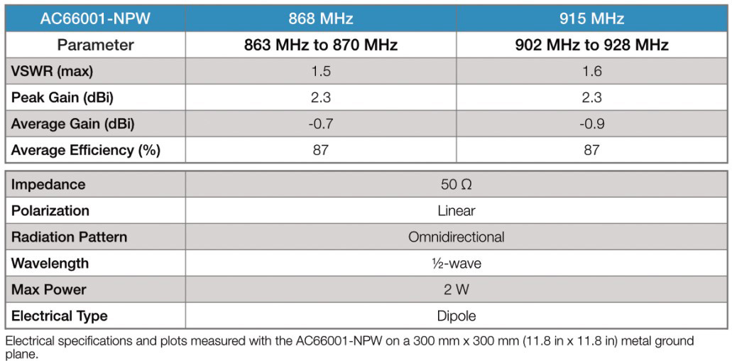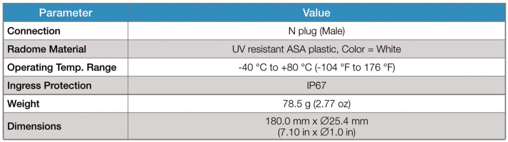 The Antenna Company AC66001-NPW robust outdoor antenna is ideal for LoRaWAN®, Wi-Fi HaLow™, IEEE 802.14.5 Zigbee®, and other sub-1 GHz industrial, scientific, and medical (ISM) applications. The AC66001-NPW is 180 mm long with N-plug connector termination and is built to operate in solutions requiring a robust, high-performance antenna. Supporting IP67 ingress protection and an ASA ultraviolet-resistant baton-style radome, the AC66001-NPW does just that for low-power wide-area network applications in the 863 MHz to 870 MHz and 902 MHz to 928 MHz (as well as 930 MHz) bands.
