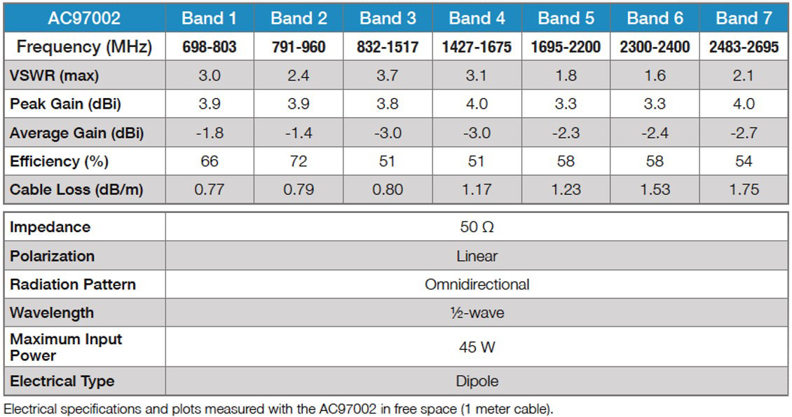 - Excellent multiband coverage including 698 MHz to 960 MHz and 1700 MHz to 2700 MHz