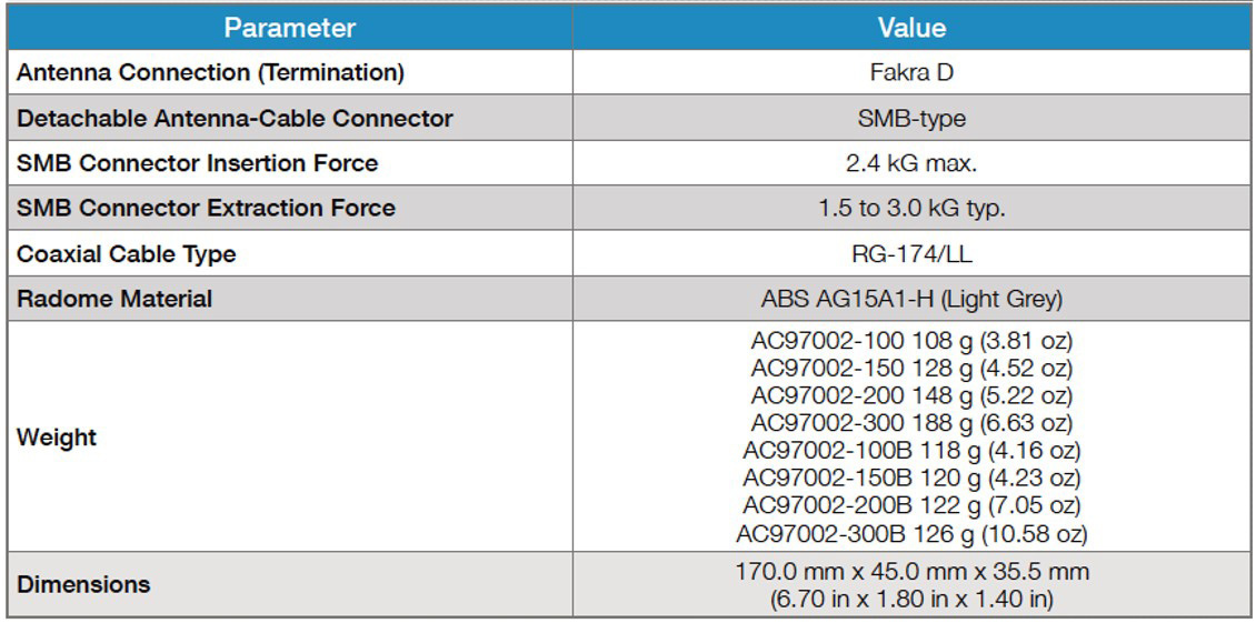 Cabled versions and cables provided with the SMB connector version use RG174LL coaxial cable terminated with an easy-to-attach Fakra D connector. Various cable length options are available.