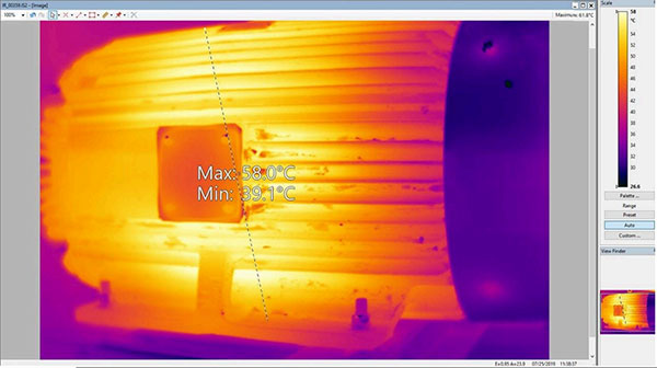 Figure 1 : Shown is a thermogram of an operating electric motor; the colors indicate the temperature of each part of the motor. (Image source: Fluke Electronics)